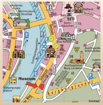 Das Museum liegt im Stadtteil Bernkastel, an der Hauptstraße, in direkter Nähe des Burgbergtunnels.Es sind Parkplätze vor dem Haus vorhanden oder Sie parken direkt auf dem Moselparkplatz. Von dort aus einfach dem Radweg flussaufwärts bis zum Ortsausgang folgen. Wir sind dann nicht zu übersehen. :-)
